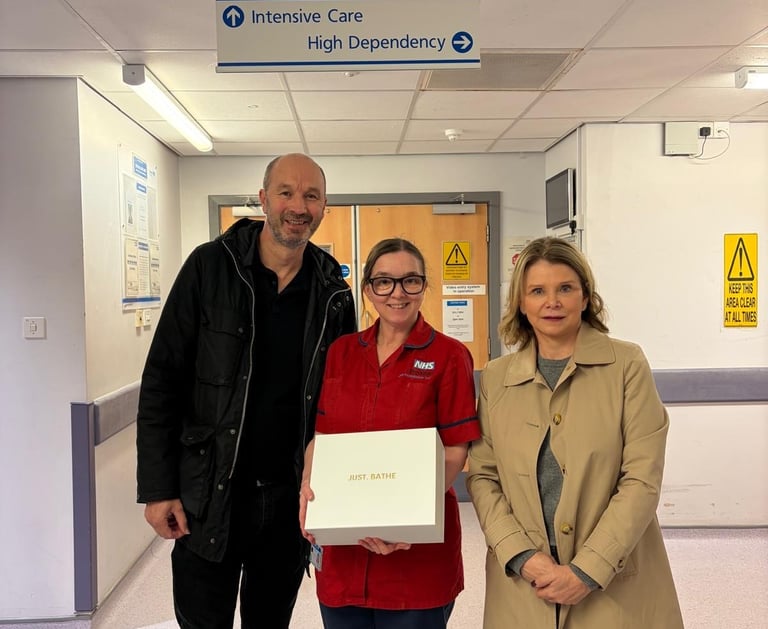 This visit held profound personal significance for JUST.BATHE'S founder, Dr. Steph Alger. It was at Salford Royal Hospital in 2020 that Dr. Alger’s beloved son sadly passed away. Returning to the very ward where such deep loss was experienced was an emotional journey for Dr. Alger and her husband, Mr. Alger. Their strength and dedication to transforming their grief into a mission of support for others is at the very heart of JUST.BATHE.